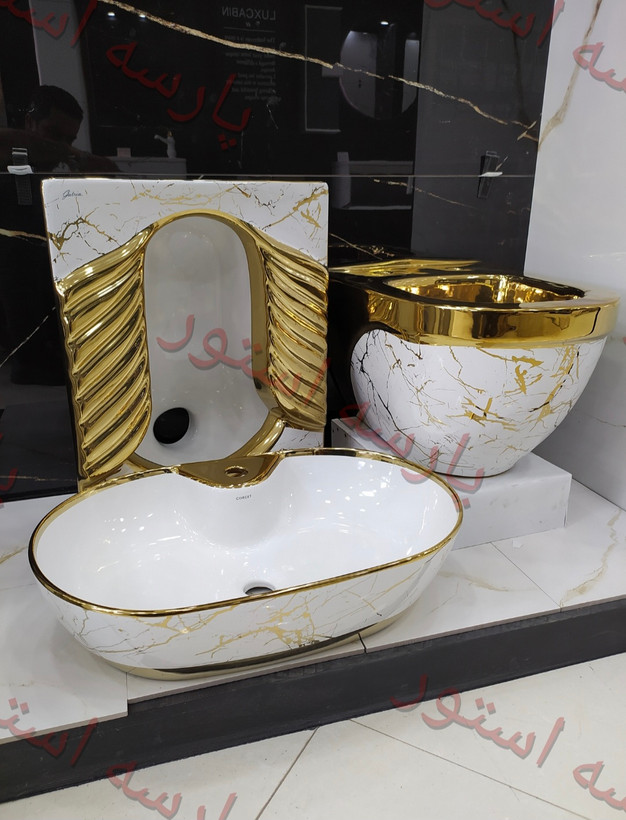 ست فرنگی وال هنگ توالت ایرانی و رویه کابینتی سفید طلایی کد118